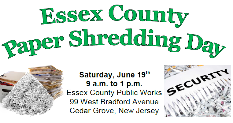 Posted June 08, 2021The Essex County Paper Shredding Day will take place on June 19th, 2021 from 9am - 1pm at the Essex County Public Works, found at 99 West Bradford Ave in Cedar Grove.