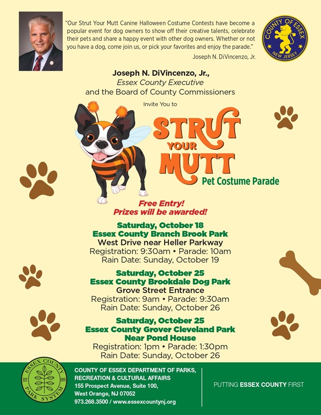Posted October 01, 2025Bring your furry friend and join the fun at Essex Countyβs beloved Strut Your Mutt Pet Costume Parade! Whether you have a dog or just want to enjoy the creative costumes and community spirit, this family-friendly event is free and open to all. Prizes will be awarded!