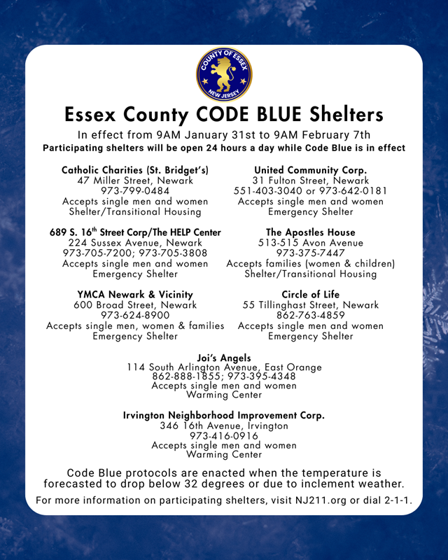 Essex County, NJ – Essex County Executive Joseph N. DiVincenzo, Jr. and Essex County Sheriff Amir Jones announced Essex County’s Code Blue procedures are being extended from Saturday, January 31st at 9 a.m. to Saturday, February 7th at 9 a.m. The declaration is for all day. Code Blue protocols are enacted when the temperature is forecasted to drop below 32 degrees or due to inclement weather. For participating shelters and warming stations, view the graphic below or visit www.nj211.org.